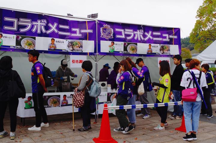 广岛三箭:球迷们排队购买球员推荐的食物(在摊位上的广告布上可以看到球员吃饭的照片)