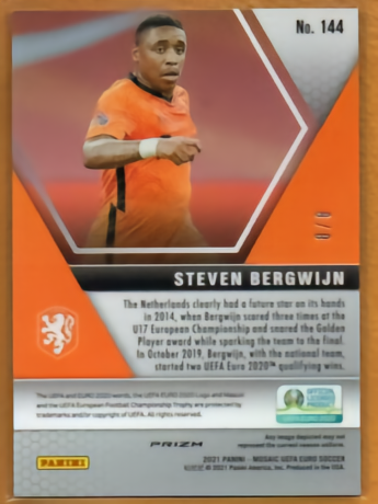 这是贝尔温2021马赛克系列欧洲杯8编尾编黑金。卡牌背面提到在2014欧洲U17足球锦标赛中,贝尔温打入3球帮助荷兰U17闯入决赛,他也当选了那届赛事的最佳球员。2019年10月,贝尔温帮助荷兰国家队在2020欧洲杯预选赛中取得了两场胜利。