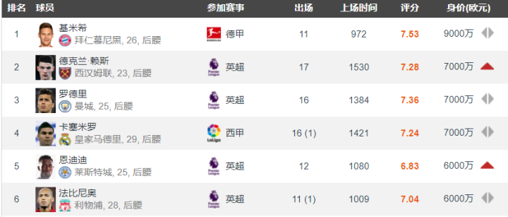 效力于英超球队西汉姆联的赖斯,在后腰位置身价排行榜上以7,000万欧元的身价排名第二,和上一期的身价相比,他的身价有了明显的增长。