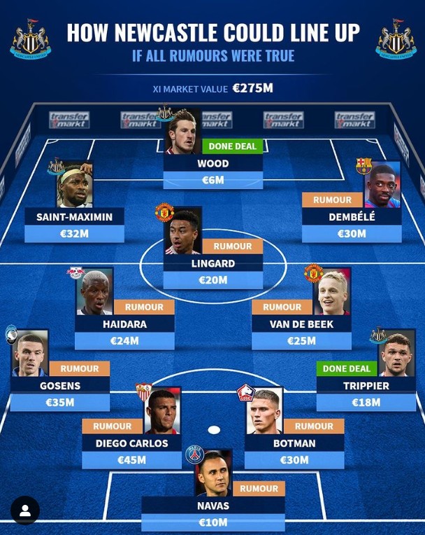 目前纽卡与多名球员有转会传闻,德国转会市场网站预测了冬窗后纽卡的首发阵容,其中登贝莱领衔,林加德、纳瓦斯等人在列。