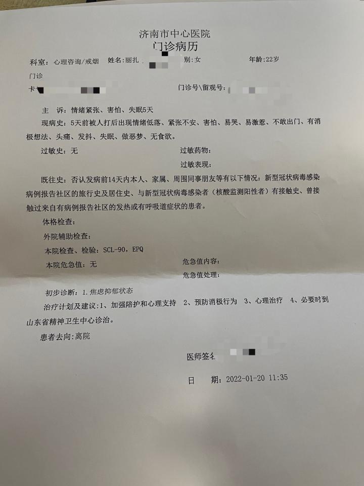 大家好,我是丽扎的姐姐。再次占用公共资源,非常感谢有这样的平台和广大网友们对我妹妹这次遭遇的关注和支持。最近也有很多的媒体朋友们联系到我们,帮助我们发声。同时也收到很多的评论和私信来关注这个事件,安慰、鼓励我们,也给我们提供了很多法律途径上的建议。再次深表感谢。得知事情发生后,父母远在老家,年纪也比较大,疫情期间也不便远行。于是我也是尽最快的时间来到了妹妹身边,来陪她一起应对。 第一次来到山东,没想到是因为这样的事情。但也感受到了济南人民的淳朴民风,不愧为礼仪之邦,看到第一时间陪伴在妹妹身边站出来陪她的朋友们也好,每一个遇到的陌生人也好,大家都互称“老师”,让我感觉非常的亲切! 1.在我了解相关的法律知识和条例后,我也认同现阶段的处罚决议行拘十日,五百元的罚款是合理的。 但是我一想到对方第一时间事发后,并不是想要诚心道歉、悔改,而是“找人”“找关系”,并且他的朋友家人对着我妹受到伤害后的态度也是:你们想怎么办 该怎么解决就怎么解决……难道对这种事情很有经验?我们还是从感情上非常无法接受这样的结果。据我妹妹告诉我,对方的父亲和叔叔在派出所更是全程试图劝说妹妹的朋友们让妹妹同意和解,别说道歉了,甚至并未正眼看过一眼我妹妹!敢问这位父亲,别人家的孩子难道不是孩子吗?如果你自己有个女儿,遭受这样的事情呢?! 根据目前所了解到的情况,无论伤情鉴定的结果如何,我们都是要去继续复议和追究的。也感谢现阶段执法部门目前为止对于此次案件的重视和处理。成源作为一个带有粉丝的公众人员,在当天对我妹实施殴打行为之前还试图挑事和伤害另一个女生。只是因为那个女生有朋友在场而避免了造成更加严重的后果。当天同时有两起案件发生,在派出所也都有报警记录和调查笔录。其次对我妹妹心理上也造成了严重的伤害,影响她之后进入社会的一个心态。成源作为一个公众人物,在公众场合闹事引起恶劣的社会影响,这个事情的性质无论如何都很严重。我想,法律是公正的,也是正义的。即便在章法之外,还有道德的审判。抛开任何的身份,每个人的所作所为,都必须要由自己去为后果买单。 2.其次,作为一个公众人物,我不管你属于什么俱乐部还是有什么样强大的背景,我想你首先应该对自己的言行举止有一个约束,你首先是一个人,是一个男人。在社会中,每个人都知道要尊老爱幼,保护弱势群体。怎么会反而拳脚相向?拒不道歉。你担心你的事业受损,生活受影响,为什么不第一时间去认错和反省自己是否也给别人带来了伤害和影响呢?我所接受的教育和认知是,一个好的有素养的人都不会这么去做。网上有很多网友们现在也在议论他的为人、私生活和过去。我们也有收到一些相关的信息,但是我真的对这些不感兴趣。从头到尾,我们都不是说想要去无端的毁掉一个人。可你,也不能这样的欺负完别人之后,如此的冷血和无畏惧。至于我方为什么第二天就在网上去曝光这个事情,以及很多“专家”的“普法”,我也真是谢谢您了。具体当时的办案人员和流程是如何进行的,我想只有我们当事人自己会比屏幕对面的您更清楚。 3.很多人都在关心妹妹现在的状态,这几天我也陪妹妹一起做完了各个受伤部位的相关检查,目前来讲,好在身体上没有受到特别严重的伤害,朋友也有调侃:你可真抗揍,两分钟都没有能把你怎么样,这反而是作为家人感到庆幸的一点,谁愿意自己的孩子真的被殴打成什么样呢。由于检查的部位比较多,这些天妹妹也往返于派出所、医院。我们一直到今天下午才结束检查。但是法医部门已经下班,联系负责的民警后,得知伤情鉴定的结果也只能在周一再出了。感谢大家的询问和关心。 然而妹妹的心理状况确实是受到了巨大的影响。这几天,妹妹很容易情绪激动,多次在去医院的路上、医院等地点,出现了情绪失控崩溃痛哭的情况。一开始我的第一反应也是想要埋怨她:大家都在关心你,为你奔波。你却在这里频繁的失控,让大家(身边的朋友)真的变得更加辛苦。后来也在跟妹妹经过深入的谈心之后,才能设身处地的从她的角度去感受那些压力和心理上的恐惧。陪她一起在派出所看到过监控录像片段的朋友也告诉我,如果姐姐能够看到监控录像的话,要做好心理准备,真的挺残忍的,我们当时看的时候都真的很痛心!感觉都有点看不下去,可我还是坚持要去看看。我真的不知道到底是为什么,会有什么样的情况这个人会对弱小的一个女生痛下毒手?!但我联系过派出所为我们处理这起案件的所长之后得知,依照法律规定,由于案件已经由警方受理,我们现在是没有权利查看监控录像的。我也只能作罢,但也大概能想象到当时妹妹的心理和身体上的痛苦和害怕!她才会不敢一个人出门,在超市看到有高大形似成源的男性,会跟我们说我要走在你们中间,我有点害怕。昨天也因为妹妹现在的情绪状态去做了相关心理方面的测试,我们看到此次事件对妹妹造成的精神和心理上的损害程度都是非常高的,中心医院的医生当时的表述也是说,是有可能会有这样的影响的!并且中心医院也表示他们医院只能做心理咨询,而妹妹现在的心理状态则要通过药物和住院等治疗才可以。建议我们再去精神卫生中心去做更加全面的检查报告和治疗。这让原本以为她受伤程度不