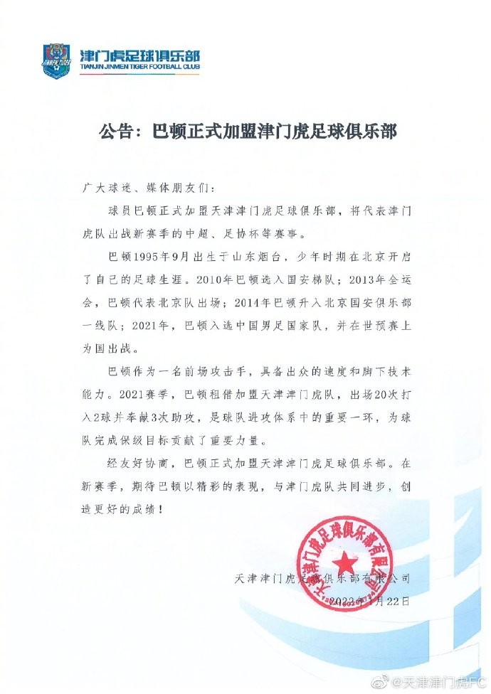 北京时间1月22日,天津津门虎官方宣布:北京国安前锋巴顿正式加盟。