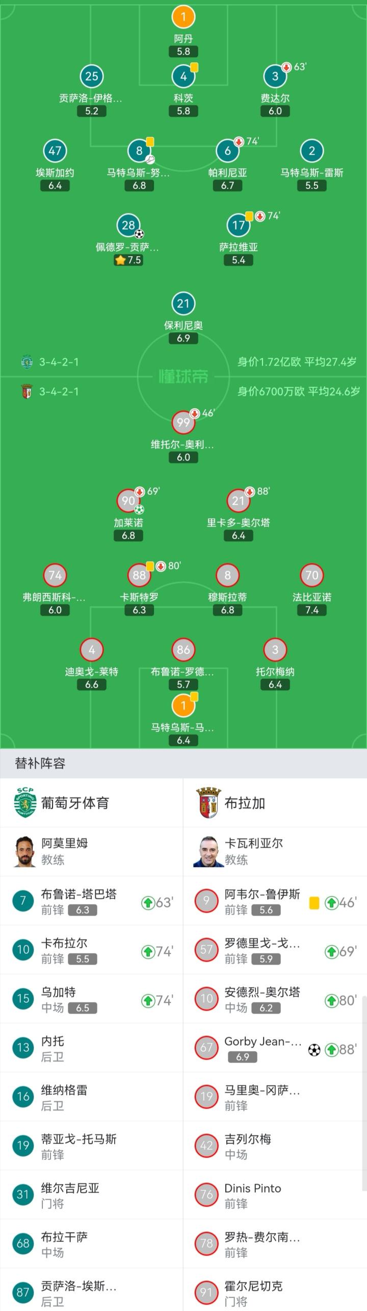 布拉加首发:1-马特乌斯-马加良斯、4-迪奥戈-莱特、3-托尔梅纳、86-布鲁诺-罗德里格斯、74-弗朗西斯科-莫拉、88-卡斯特罗(80'10-安德烈-奥尔塔)、8-穆斯拉蒂、70-法比亚诺、21-里卡多-奥尔塔(88'67-巴普蒂斯特)、90-加莱诺(69'57-罗德里戈-戈麦斯)、99-维托尔-奥利韦拉(46'9-阿韦尔-鲁伊斯)