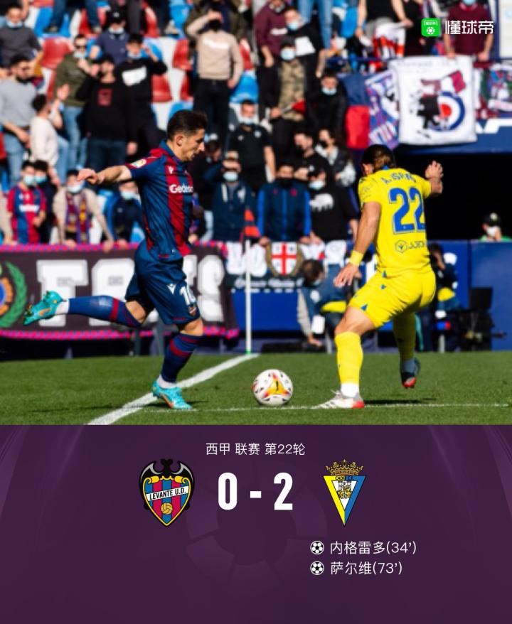 莱万特0-2加的斯,内格雷多头球破门,萨尔维建功