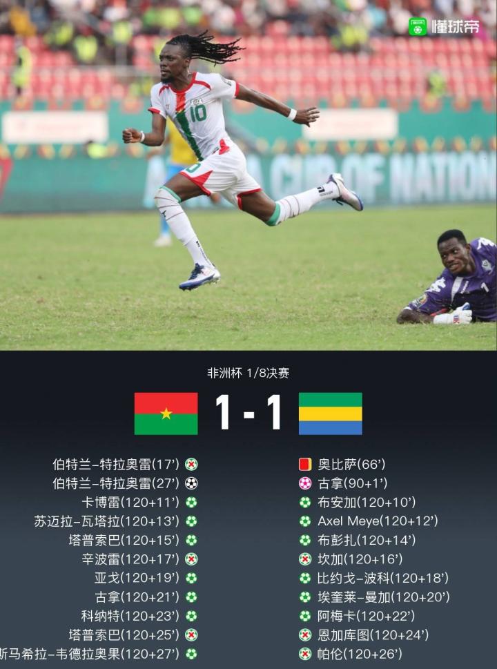 北京时间1月24日00:00,非洲杯1/8决赛展开争夺,布基纳法索对阵加蓬。上半场,伯特兰-特拉奥雷失点后将功补过单刀破门,布彭扎爆射得手因越位在先被判无效。下半场,奥比萨累计两黄被罚下,埃奎莱-曼加抢点头槌打在古拿身上折射入网完成绝平。加时赛中,阿卜杜勒-塔普索巴进球无效。点球大战中,坎加、辛波雷、恩加库图、阿卜杜勒-塔普索巴、帕伦先后罚失;伊斯马希拉-韦德拉奥果打入制胜点球。最终,布基纳法索点球大战7-6,总比分8-7险胜十人加蓬,晋级非洲杯8强。