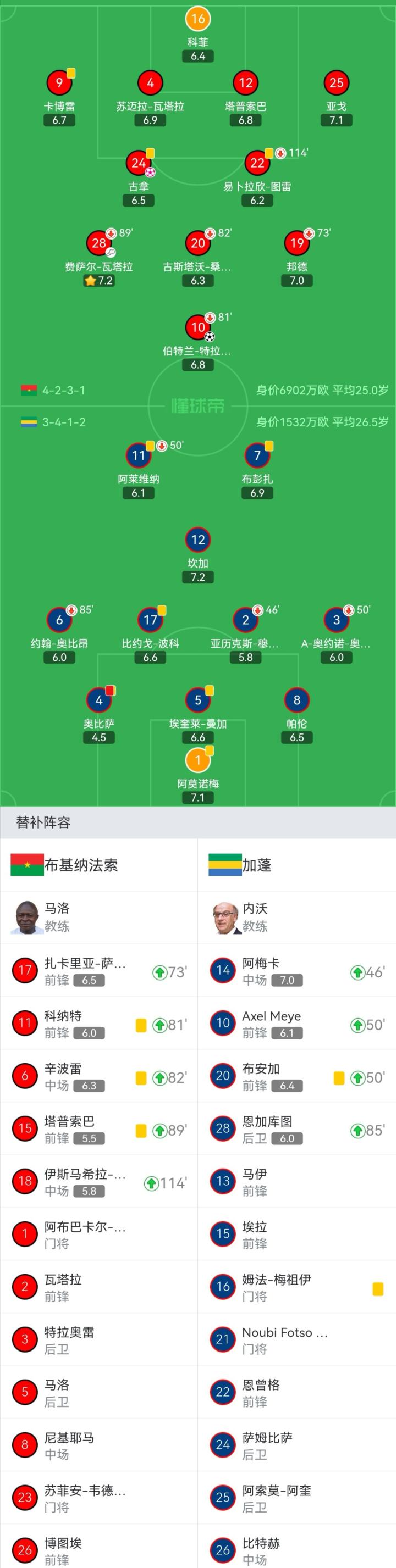 布基纳法索首发:16-科菲、9-卡博雷、14-达约、12-塔普索巴、25-亚戈、24-古拿、22-易卜拉欣-图雷(113'18-伊斯马希拉-韦德拉奥果)、20-古斯塔沃-桑加雷(81'6-辛波雷)、10-伯特兰-特拉奥雷(81'11-科纳特)、28-费萨尔-瓦塔拉(88'15-阿卜杜勒-塔普索巴)、19-邦德(72'17-扎卡里亚-萨诺戈)