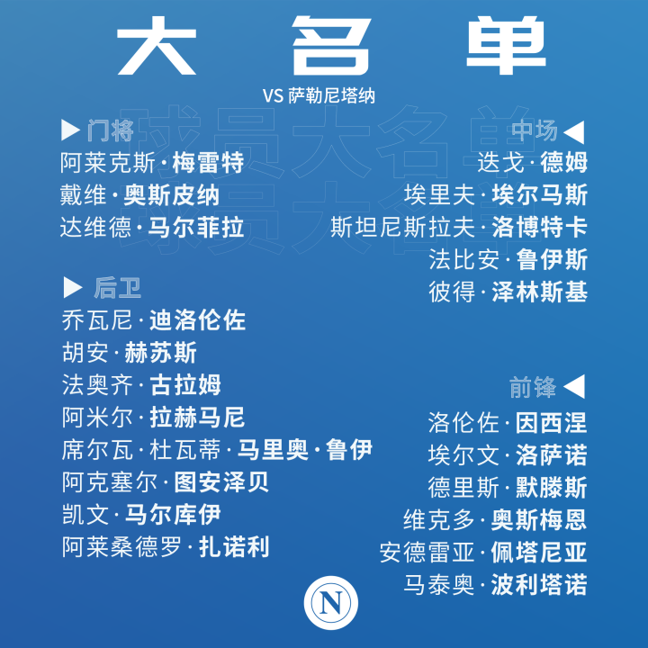 大名单 | 我们将在今晚意甲联赛第23轮主场迎战...那不勒斯足球俱乐部 @懂球帝2022-01-23 18:49大名单 | 我们将在今晚意甲联赛第23轮主场迎战萨勒尼塔纳的大名单——门将:奥斯皮纳、梅雷特、马尔菲拉;后卫:迪洛伦佐 、胡安·赫苏斯、古拉姆、拉赫马尼、马里奥·鲁伊、马尔库伊、图安泽贝、扎诺利;中场:德姆、埃尔马斯、洛博特卡、法比安、泽林斯基;前锋:因西涅、默腾斯、洛萨诺、奥斯梅恩、佩塔尼亚、波利塔诺。展开更多