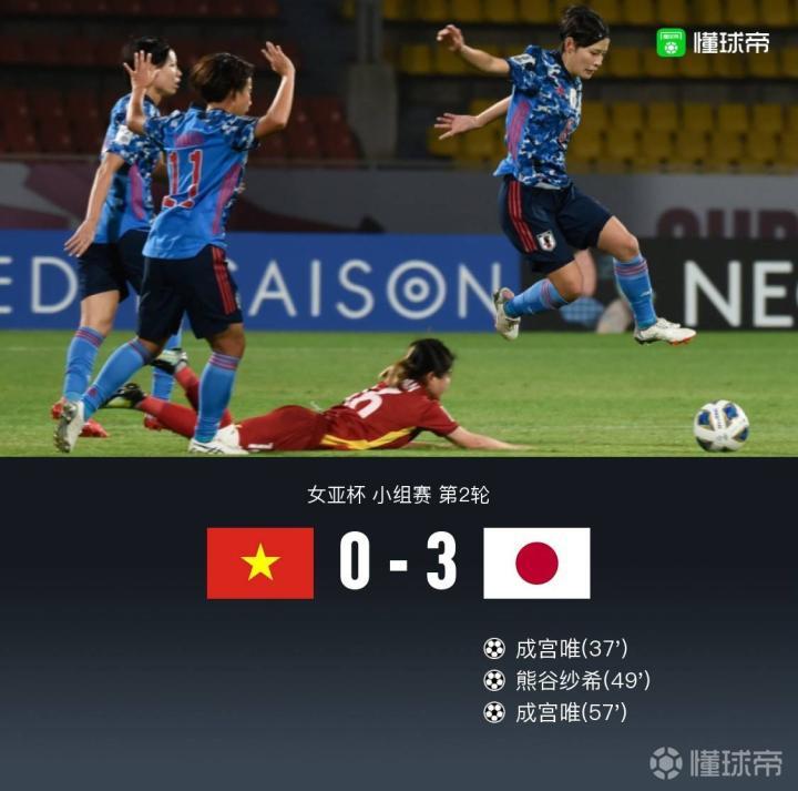 北京时间1月24日22:00,女足亚洲杯小组赛C组,越南女足对阵日本女足。上半场比赛日本队占据绝对主动,成宫唯补射破门;下半场,成宫唯完成梅开二度,熊谷纱希门前捡漏得分,最终日本女足3-0完胜越南队,携手韩国女足小组提前出线。