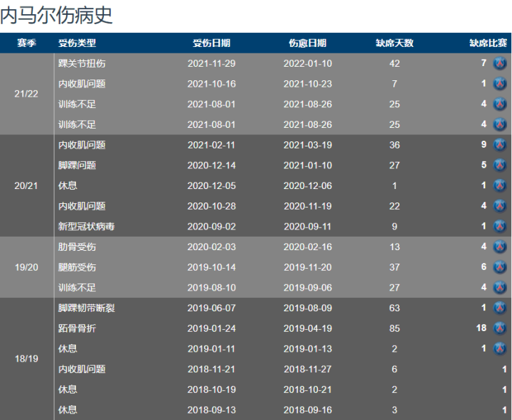 但在中路对身体的极强的负荷,显然让内马有些力不从心,在短短的21至22赛季,内马尔缺席的天数就将近三个月时间,缺席的比赛也多达10场以上。
