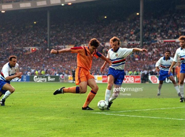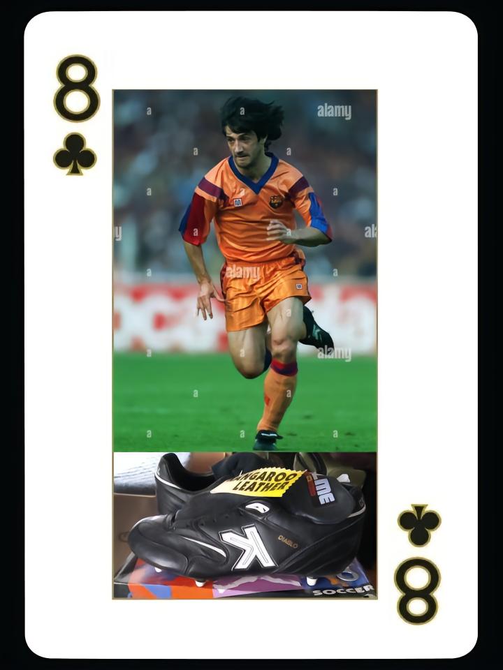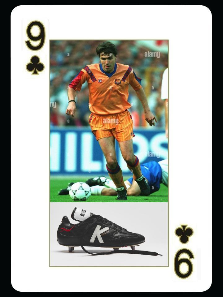 巴萨梦一时期的中场核心是谁?并不是瓜迪奥拉,而是何塞.巴克罗,这个来自皇家社会的小个子,也是1988年克鲁伊夫上任后钦点的球员,此后他为巴萨出场359场,打入72球。1992年欧冠决赛上,他使用的就是kelme的diablo球鞋。巴克罗颇具领导才能,在亚历山科退役后,他成为巴萨和西班牙队双料队长。但他穿球鞋却越来越非主流,穿过几款从来没有见过的球鞋,1994年世界杯,巴克罗使用的球鞋是lotto的stadio。1997年巴克罗在巴萨第二次获得优胜者杯后,离开巴塞罗那,前往墨西哥联赛养老退役。