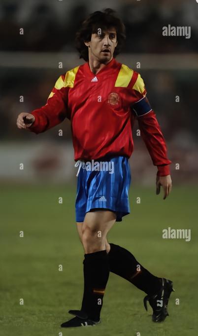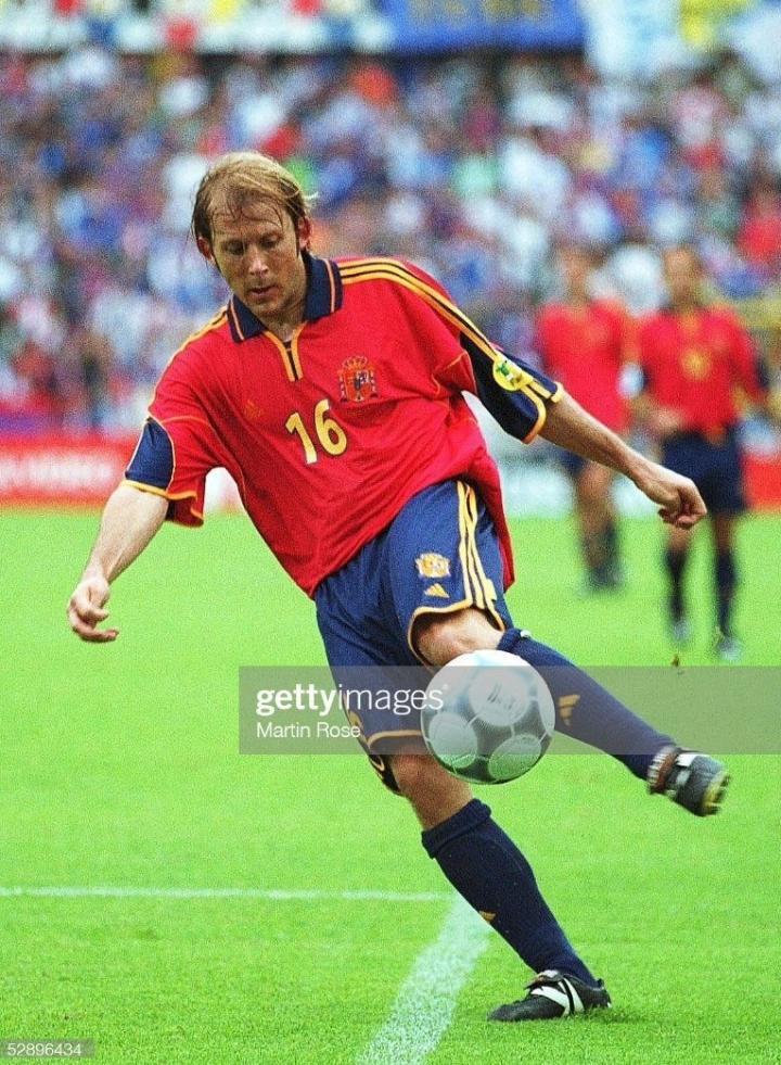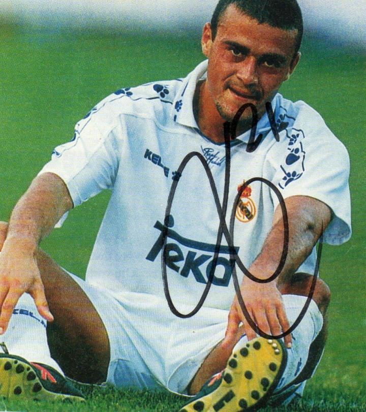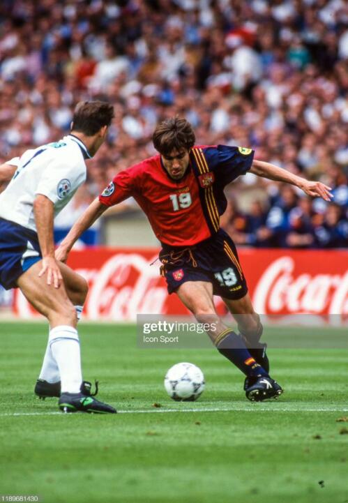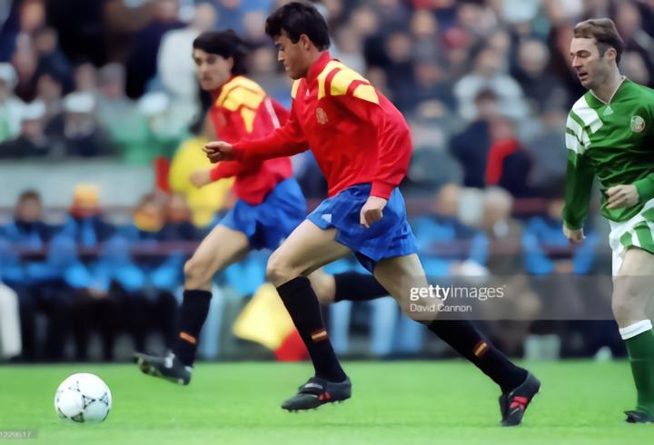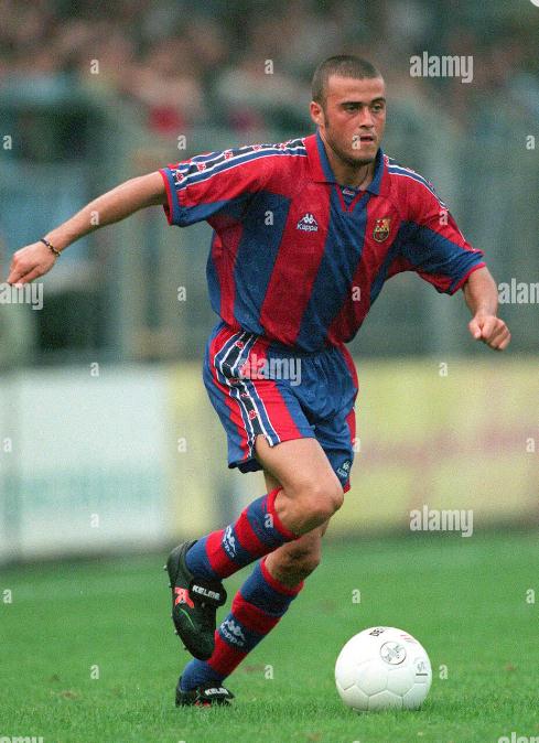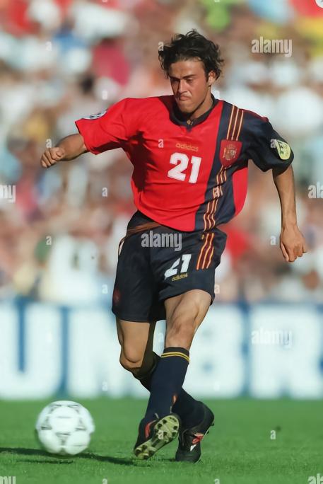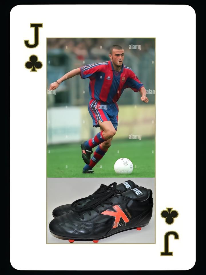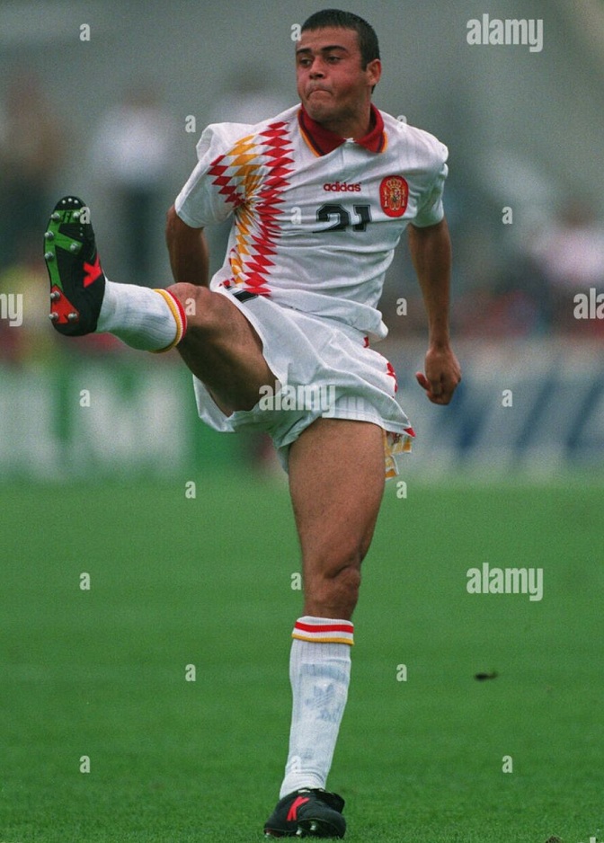 相信大多数人对卡尔美球鞋的第一印象,应该是来自于1994年世界杯西班牙队的路易斯恩里克。他在和意大利队的比赛中,穿着一双红色k logo的球鞋,非常抢眼,结果被塔索蒂一肘子打断鼻梁,血染世界杯,当时我就对他的红k球鞋留下了印象。不过当时他还效力于皇家马德里,恩里克90-91赛季在希洪竞技大放异彩,之后加盟皇马,1992年作为主力参加了奥运会并且获得冠军。恩里克是国际足坛罕见的多面手,据说打过除了门将外其他所有位置,所有在皇马常年主力。1996年欧锦赛后,他和皇马闹翻,恩里克加盟死敌巴塞罗那,引起轰动。