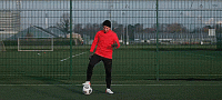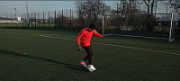 如果我们用右脚做这个动作,那么我们必须转到左边,把它甩过我们的肩膀,接着转身控制球。我们用惯用脚踢球,球弹起来,用惯用脚踢球,踢向惯用侧肩膀,我们向弱侧转身,控制球。