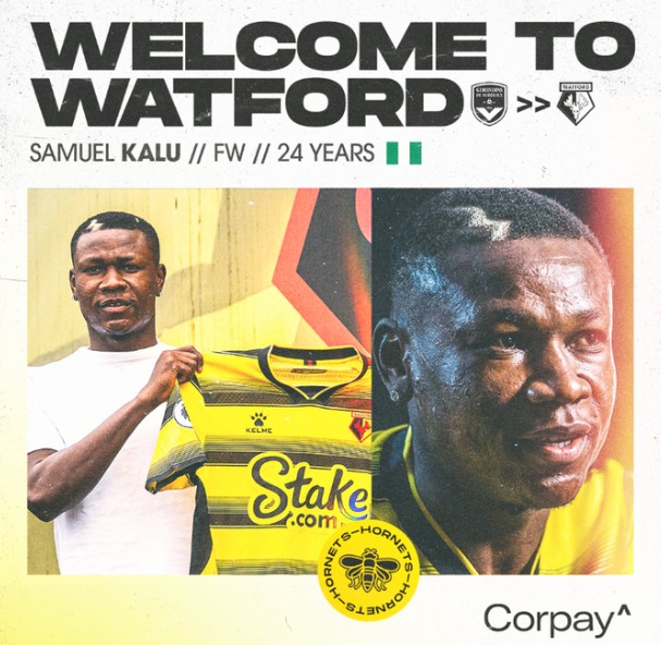 官方声明里写道:“24岁的卡卢成为了大黄蜂的一员!这位尼日利亚边锋从波尔多加盟沃特福德,合同签约到2025年6月。”