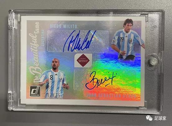 Donruss系列阿根廷的双签选取的是两位传奇球员米利托和贝隆,这张是1/25的首编。贝隆的签字非常完美,墨迹清晰完整,米利托的签字则有很明显的出框,这与他的签名方式有一定关系,比较可惜。整张卡的卡品是很不错的,双签也十分好看。