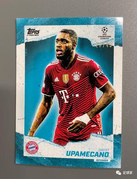 Topps最新的Gold系列49编采用的是海水蓝般的设计,这与于帕梅卡洛所穿的拜仁主场红色球衣有着很鲜明的色彩对比,造成了视觉上的冲击,小菲我非常喜欢这个设计。