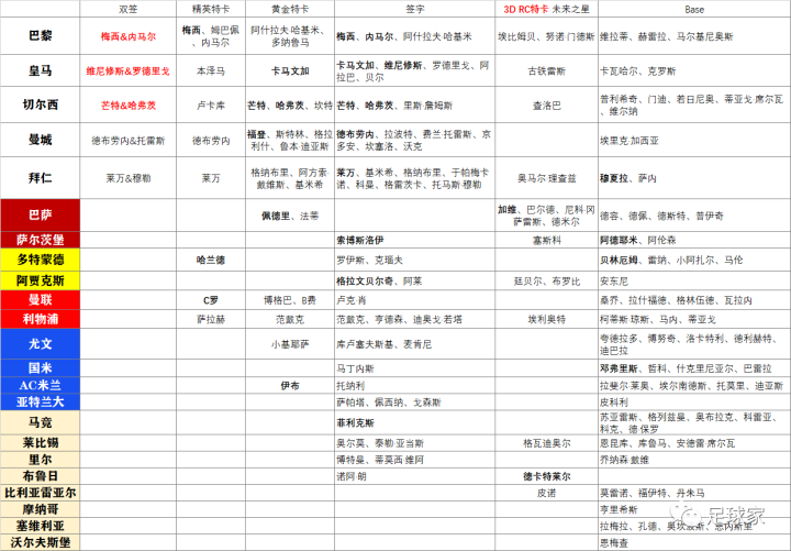 这是Topps最新的Gold系列的组队表,和刚刚的Donruss类似,我们也将一些球队进行了合并,表上从马竞开始的球队都组合到了一起。这个系列的设计是非常不错的,该系列的双签是非常大的一个博点。