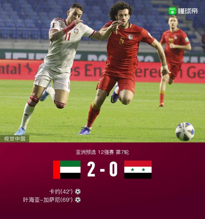 阿联酋2-0叙利亚,继续位居A组第三,卡约传射