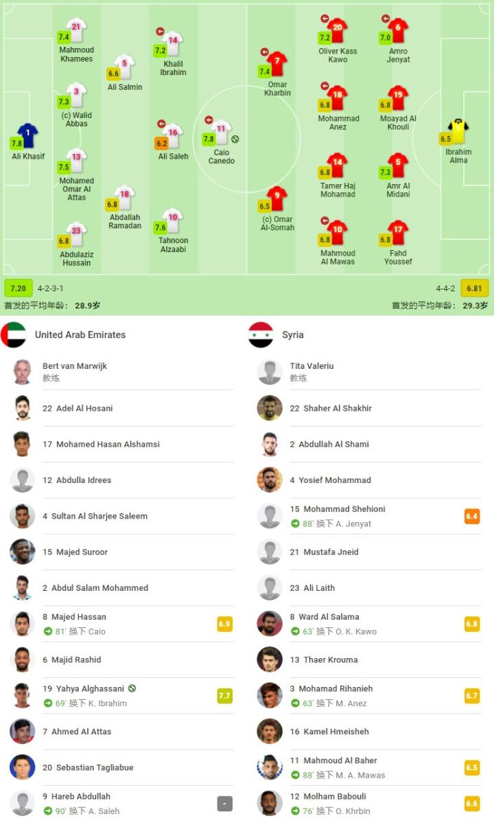 阿联酋首发:1-阿里-胡迈德、23-阿卜杜勒阿齐兹-侯赛因、3-瓦利德-穆拉德、13-穆罕默德-阿塔斯、21-马哈茂德-哈米斯、5-阿里-萨尔明、18-阿卜杜拉-拉马丹、14-哈利勒-易卜拉欣(69' 19-叶海亚-加萨尼)、10-塔农-扎阿比、11-卡约(80' 8-马吉德-艾哈迈德)、16-阿里-萨利赫(90+2' 9-哈里卜-苏海勒);