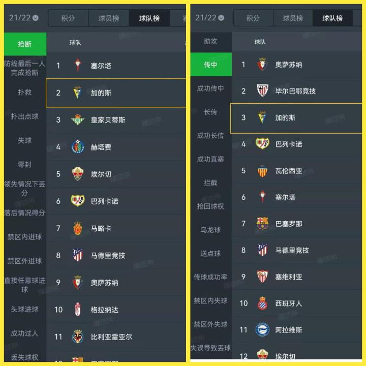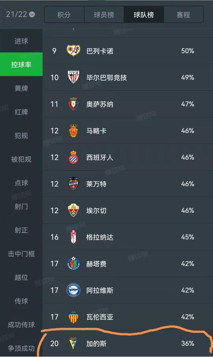 伴随低控球率,加的斯的射门、射正、传球、成功传球等次数都排在西甲倒数前二。