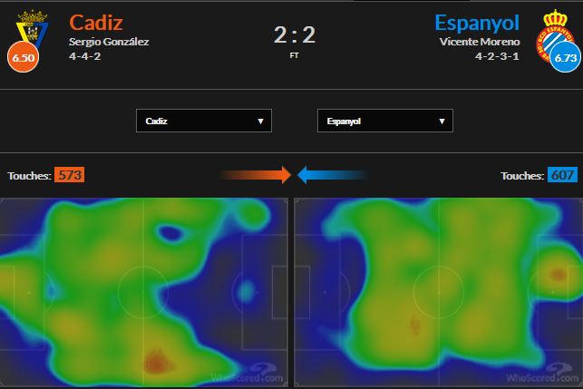 反击时看球队的进攻模式是什么?从加的斯2-2战平西班牙人比赛热图可以看出,进攻中路有一块很大空挡。