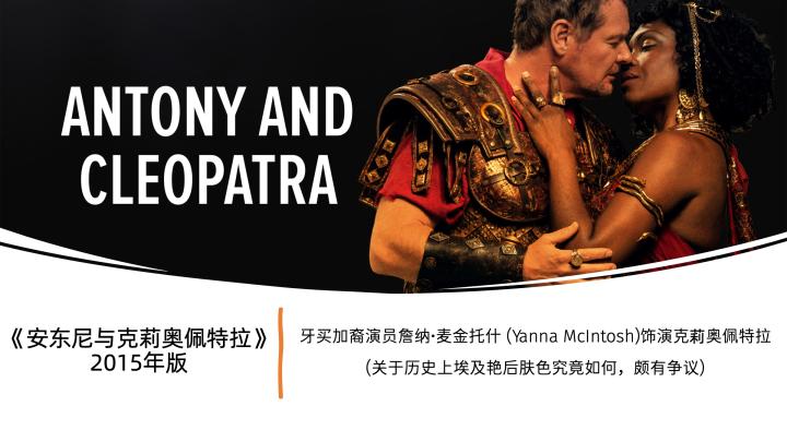 安东尼是罗马共和国末期的“后三头”之一,克莉奥佩特拉就是“埃及艳后”,也是安东尼的情人,这部剧的场景一半在罗马,另一半在埃及北部的海港城市——亚历山大港。