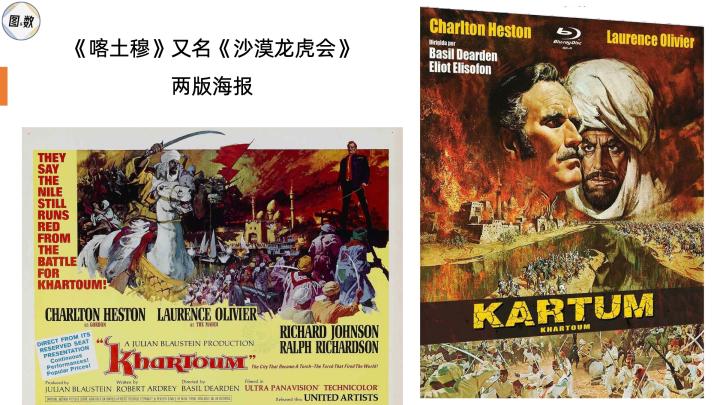 英国在1966年上映了一部与喀土穆同名的电影,讲述的是苏丹人与英国人、埃及人以及埃塞俄比亚人之间的马赫迪战争,重点是历时10个月的喀土穆围城战,其中苏丹的马赫迪军有点类似晚清的太平军。因为影片的主角分别是苏丹的马赫迪和英国的戈登少将,所以《喀土穆》又被翻译为《沙漠龙虎会》,这部影片曾获奥斯卡最佳原创剧本提名。
