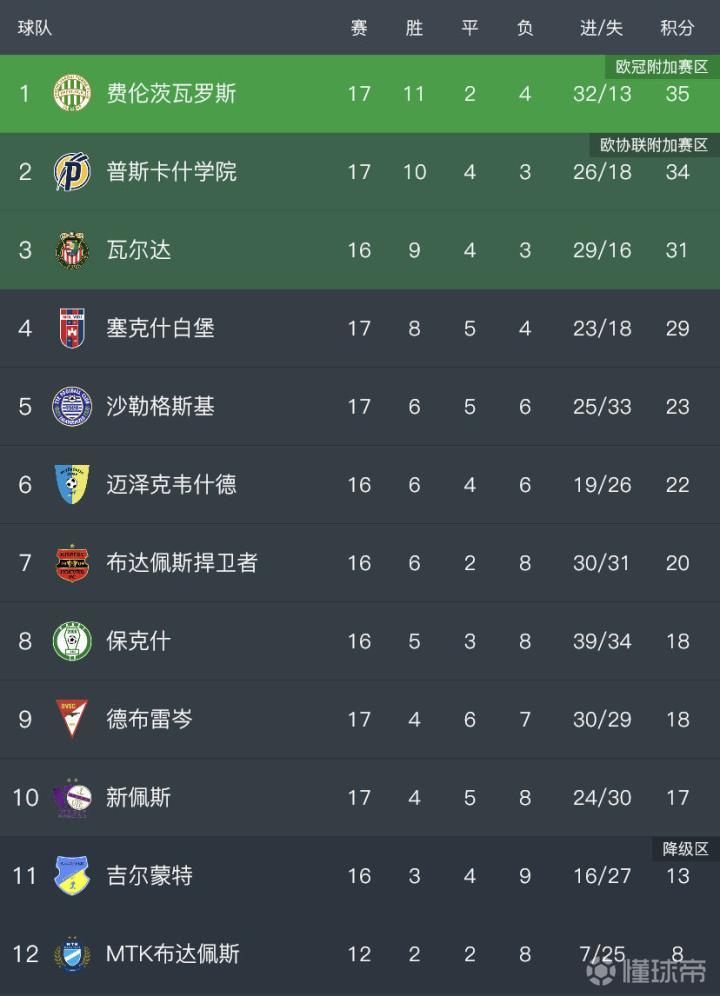 匈甲最新夺冠赔率:费伦茨瓦罗斯第一,普斯卡什学院...日不落的爱恋 @懂球帝2022-01-28 22:39匈甲最新夺冠赔率:费伦茨瓦罗斯第一,普斯卡什学院第二 经过40天冬歇期,匈牙利足球甲级联赛将于1月29日重燃战火,领头羊费伦茨瓦罗斯虽然只领先1分,但数据表明其夺冠希望已远远大于第二名普斯卡什学院。 而合计拿到过43次联赛冠军的两支老牌劲旅新佩斯与MTK布达佩斯均排在保级区,早早失去了争冠希望。展开更多