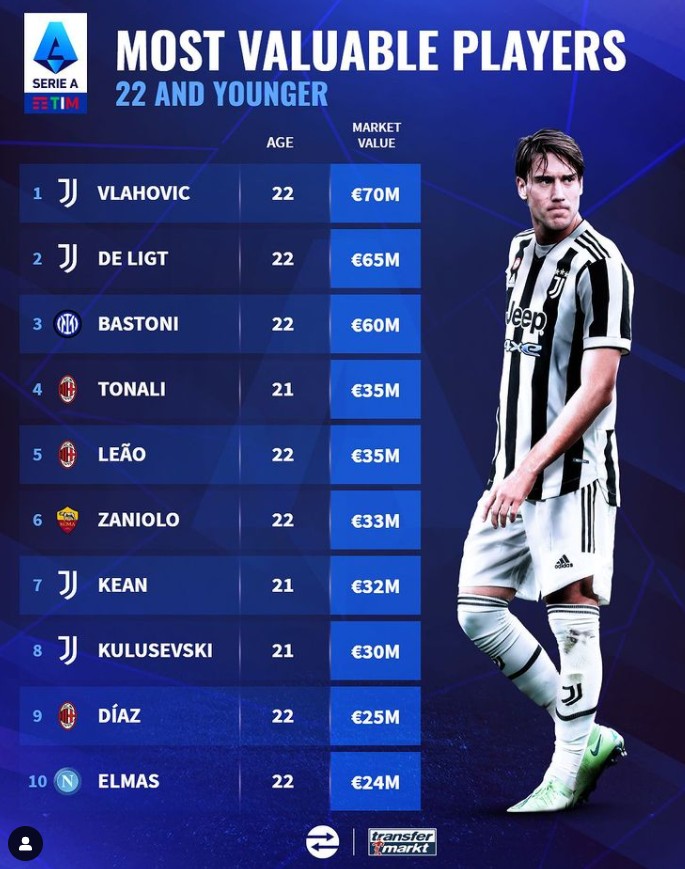 意甲U22球员身价排名:弗拉霍维奇第一,德利赫特第二