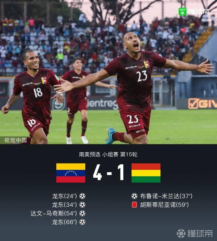 委内瑞拉4-1玻利维亚结束连败,龙东戴帽,达文-马奇斯破门