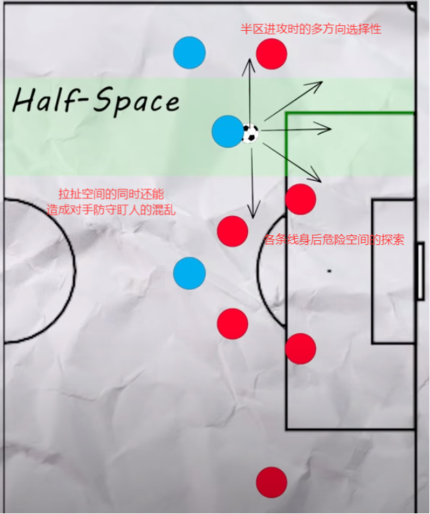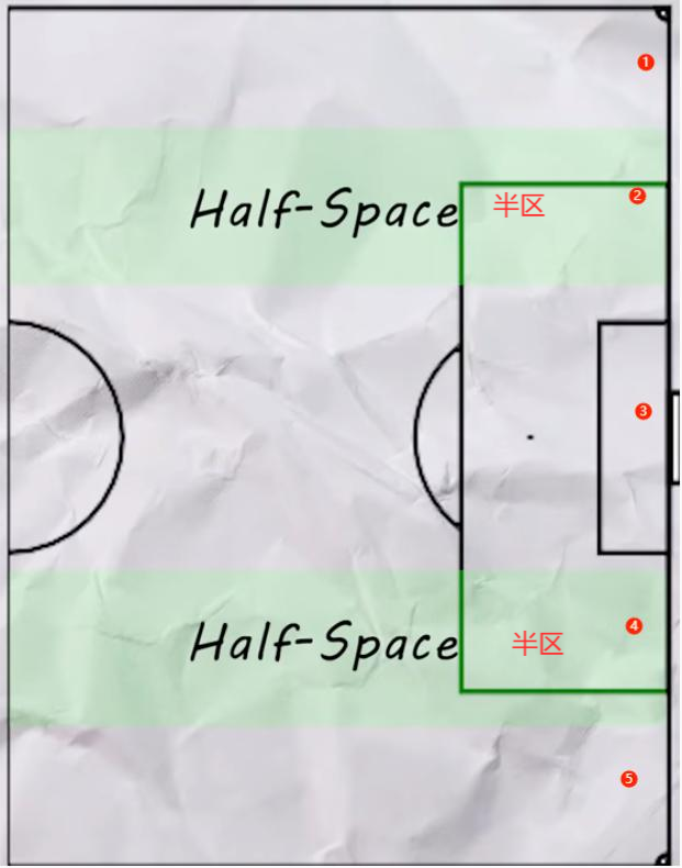 而对于半区的利用与前文类似,避免中路过度拥挤的同时来寻求更多空间及时间进行传球或射门。