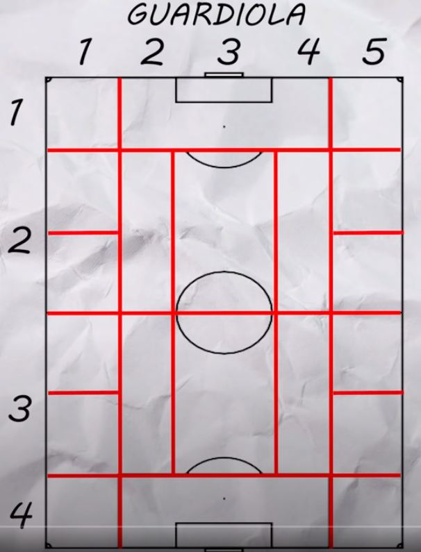 与传统的18格分割方法有些区别的地方是,瓜迪奥拉在引入半区后,将场地分割成了20格。