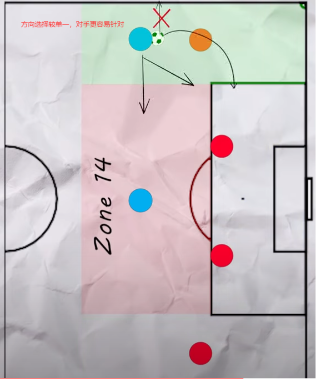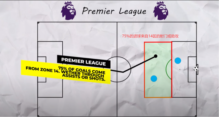 当然只是进入14区是远远不够的,球队在该区域内所做出的选择也影响着球队的表现。如果你在14区停留的时间过长,对手的防守也会尽快的回位,射门的空间也会被急剧地压缩,据数据显示,在14区内控球时间少于2.7秒的一次进攻序列会让你的球队更容易获得射门机会。14区内进攻方向的选择也同样重要,分边还是直塞进禁区亦或是回传等选择所创造出的射门角度和进球概率也是天差地别。而在高位逼抢中,14区也扮演着重要的角色,在高压所导致的进球中,有相当一部分的”事发地点”就发生在该区域内。