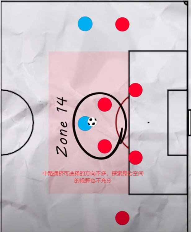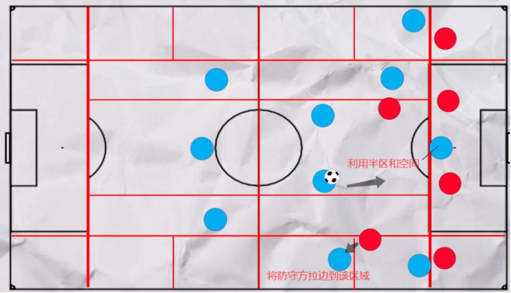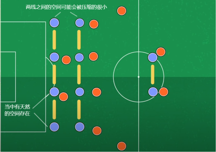 防守方为了加强14区的防守,他们往往会布置多条防守线来限制对手的进攻区域以及实施拦抢等防守行为(一般来说是两到三条)。而我们现在能经常看到的一个画面是,防守方将防守线压缩的非常紧密,这也让进攻方可利用的纵向空间(线与线之间)变得非常的狭小。而对于横向空间,由于场地宽度和防守阵型的天然存在,每个防守球员之间的空档相对来说会比较大,这也为半区的利用(引入)提供了机会。