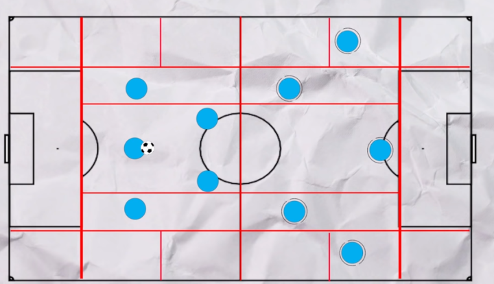 瓜迪奥拉对于位置要求的不同点在于,在同一横向区域内,队员人数不能超过3个,而在纵向区域内,队员人数不能超过2个,中路区域因为比较宽,所以人数可以多一些(静态分析会过于理想化,在动态的比赛中球员可能会出现违背这些要求的情况)。这样的安排让球队在有球时能够一直保持阵型的层次感,为传球提供更多的角度,而提前进入预设好的区域,也让球员的出球具备了明确的目的性。在球进入预设区域后,球员的习惯性“落位式移动”又会让他们再次去主动占据新的区域,为下一步的战术执行创造新的条件。