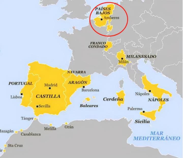 ▲西班牙通过政治联姻占领尼德兰(红色)