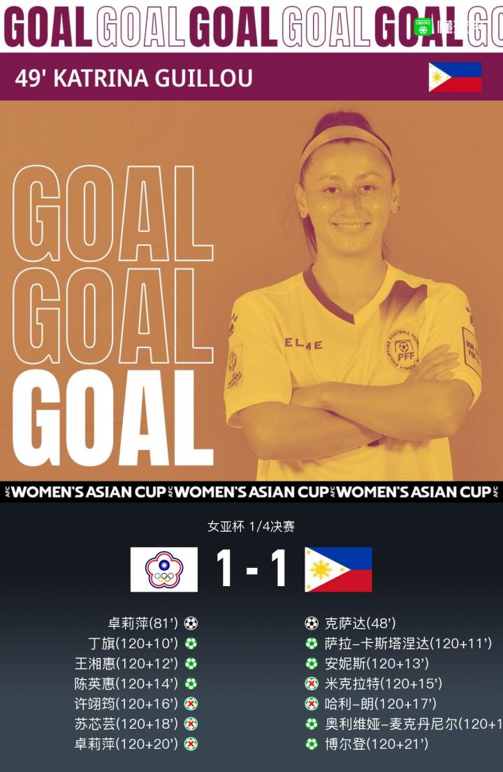 北京时间1月30日22:00,女足女足亚洲杯1/4决赛展开较量,上半场,博尔登射门造险,陈燕萍射门被扑。下半场克萨达抢点破门,卓莉萍世界波破门扳平比分,常规时间结束,比赛进入加时。加时赛波尔登射门偏出,吉尤小角度搓射空门,皮球滑门而过,比赛进入点球大战。菲律宾门将连续三次扑出中国台北队的点球,随后波尔登罚入制胜点球。全场比赛结束,中国台北女足总比分4-5被菲律宾女足淘汰,菲律宾女足也获得了世界杯的参赛格。