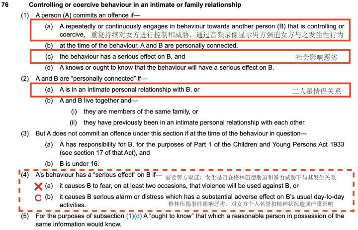 上图所展示的是英国《2015年严重犯罪法》第76条控制或胁迫行为罪,按照该条法律只要做实格林伍德犯有本节所述的罪行就将至少被判处12个月的监禁或罚款(即决判决);而一旦上诉法院,格林伍德大概率未来五年的宝贵时光都要在监狱中渡过了……