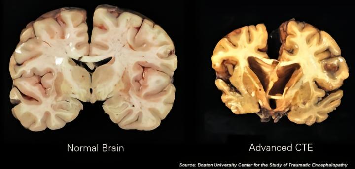 [图]对比左右两个颅脑断面解剖切片,我们很容易发现普通人的大脑(左)和慢性创伤性脑病变(CTE 右)大脑的区别,后者的大脑出现了严重的萎缩和组织坏死