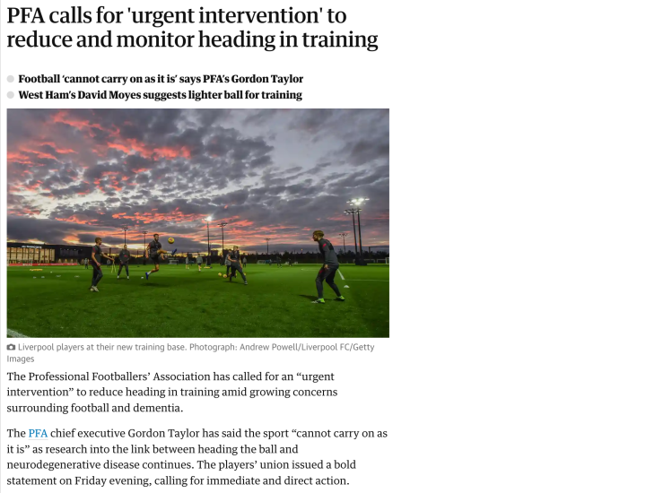 每名足球球员每个星期都会遭受反复的头部冲击,也许是高速旋转的传中球,是和对手拼抢时受到的脑震荡,以及球场上每一次有意无意的小细节。