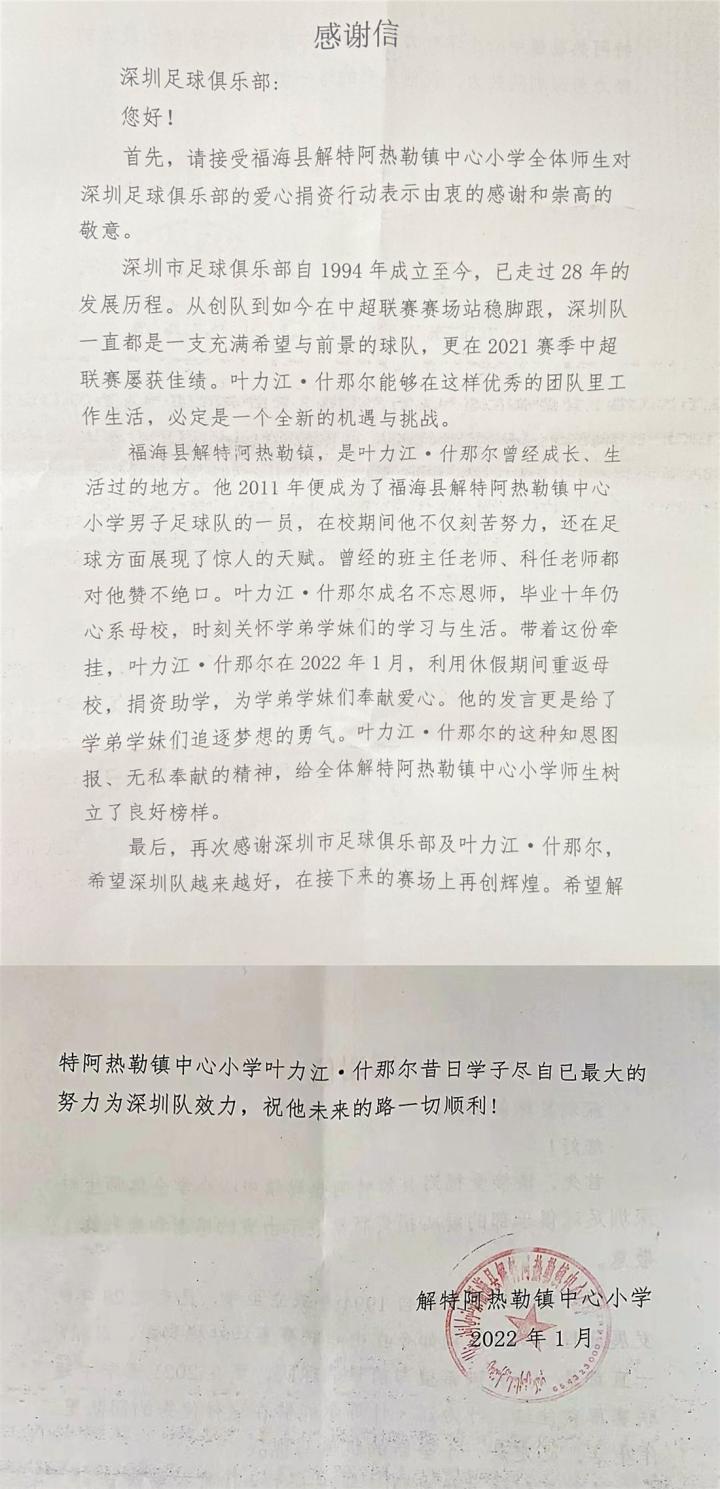 叶力江表达了对解特阿热勒镇中心小学的感谢,他说道:“我在2010到2012年在中心小学上学,2013年去到广东发展足球生涯。如今时隔十年再次回到母校我非常激动,感谢学校为深足俱乐部准备的欢迎仪式。现在我以职业球员的身份回到这里,我很开心,我以后要更加努力,为我的俱乐部、我的家乡、我的国家争光。”