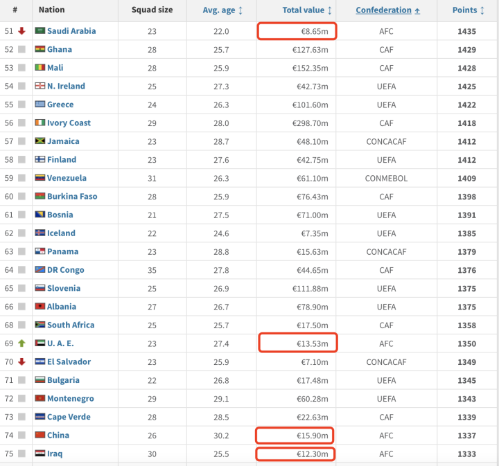 假设只看身价,国足的表现是令人汗颜的,在十二强赛的所有球队中,亚洲第一支出线的球队伊朗总身价是7660万欧元,旅欧球员遍地开花的日本总身价是7455万欧元,同样提前出线的韩国也有5225万欧元,澳大利亚的身价是国足的两倍。除此之外,其余球队甚至是沙特的身价都比国足要低。按照唯身价论,国足岂不是该顺利获得附加赛的资格?
