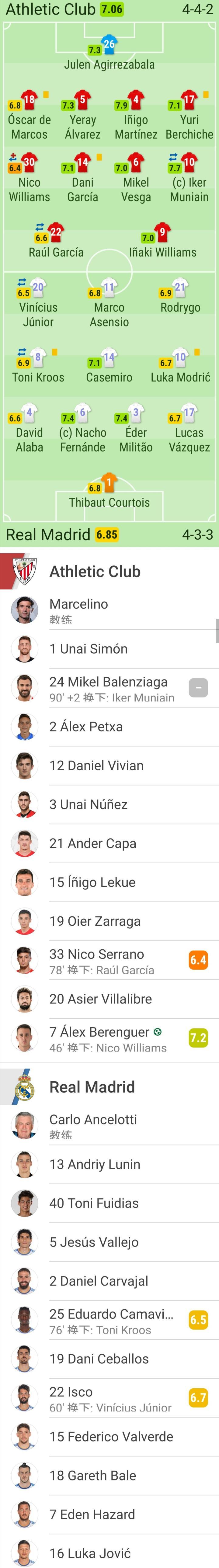 皇家马德里首发:1-库尔图瓦、17-巴斯克斯、3-米利唐、6-纳乔、4-阿拉巴、8-托尼-克罗斯(75'25-卡马文加)、14-卡塞米罗、10-莫德里奇、11-阿森西奥、20-维尼修斯(60'22-伊斯科)、21-罗德里戈
