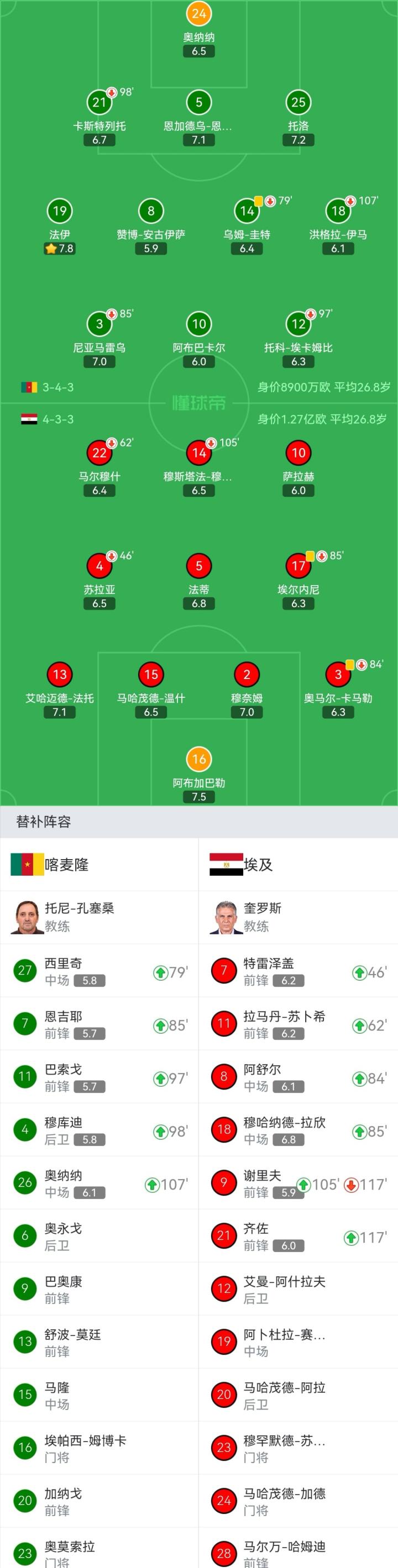 喀麦隆首发:24-奥纳纳、21-卡斯特列托(98'4-穆库迪)、5-恩加德乌-恩加德久、25-托洛、19-法伊、18-洪格拉-伊马(107'26-让-奥纳纳)、8-赞博-安古伊萨、14-乌姆-圭特(79'27-西里奇)、3-尼亚马雷乌(85'7-恩吉耶)、12-托科-埃卡姆比(97'11-巴索戈)、10-阿布巴卡尔