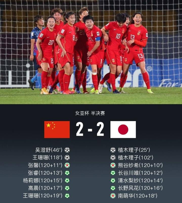 回顾这场比赛,日本女足在第25分钟由植木理子甩头破门,1分领先;中国女足在第46分钟,由替补上场的肖裕义凌空垫射,帅气破门,扳平比分;双方下半场都未进球,进入加时赛,在第102分钟,日本女足利用定位球,再次由植木理子头槌破门,又1分领先;第119分钟,王珊珊利用队友45度斜传助攻,积极抢点垫射破门,完成2比2绝平。最后点球大战,双方第1个球都没有进,随后3个都打进。而日本女足第5个点球被门将朱钰扑出,中国女足队长王珊珊打入。最终,中国女足凭借点球大战4比3,总比分6比5战胜日本,晋级亚洲杯决赛。