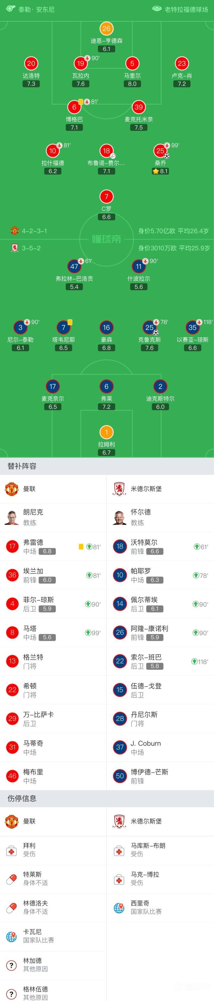 曼联首发:26-迪恩-亨德森、23-卢克-肖、5-马奎尔、19-瓦拉内(90' 4-菲尔-琼斯)、20-达洛特、18-布鲁诺-费尔南德斯、39-麦克托米奈、6-博格巴(82' 17-弗雷德)、25-桑乔(100' 8-马塔)、7-C罗、10-拉什福德(82' 36-埃兰加);