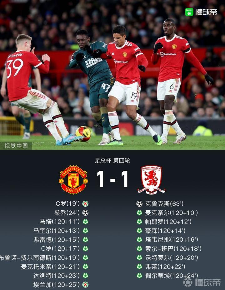 点球大战第八轮,米德尔斯堡的佩尔蒂埃罚进,曼联小将埃兰加打高,最终曼联点球大战7-8不敌米德尔斯堡。