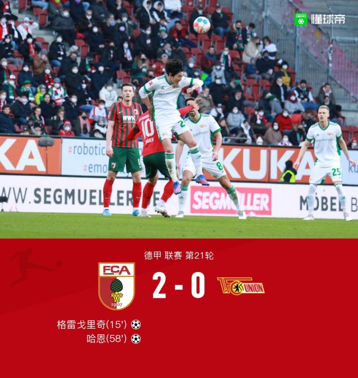北京时间2月5日22:30,德甲第21轮,奥格斯堡主场对阵柏林联合。上半场,吉塞尔曼头球顶偏,格雷戈里奇利用对方失误推射破门。下半场,哈恩世界波破门,米歇尔远射打偏,远藤溪太小角度打门被扑出,最终,奥格斯堡2-0柏林联合。