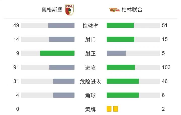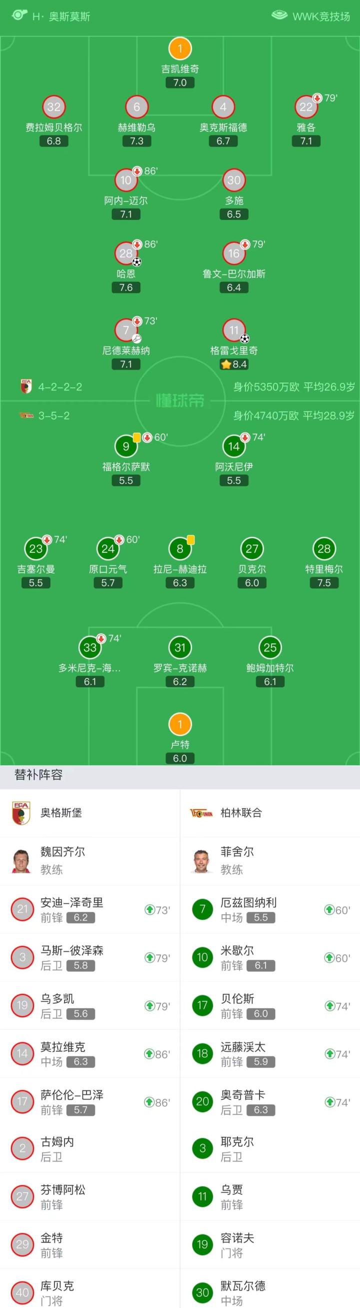 奥格斯堡首发:1-吉凯维奇、22-雅各、4-奥克斯福德、6-赫维勒乌、32-费拉姆贝格尔、10-迈尔、30-多施、28-哈恩、16-巴尔加斯、7-尼德莱赫纳、11-格雷戈里奇