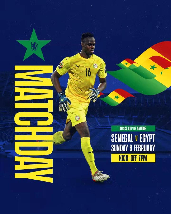 当地时间2月6日晚上7点,塞内加尔与埃及将在非洲杯决赛上展开较量,切尔西官推发布了一张海报为门迪加油,并配文:祝决赛好运!