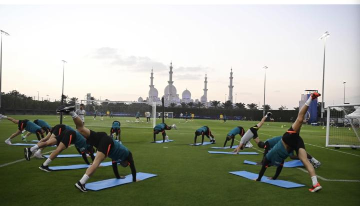这是踢足球的绝佳条件,日落时分,随着凉爽的微风吹拂,气温逐渐降低,下半场的训练在谢赫·扎耶德大清真寺壮观的背景前的泛光灯下进行。